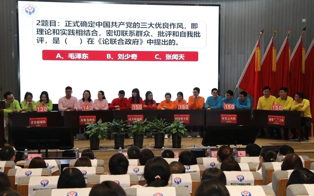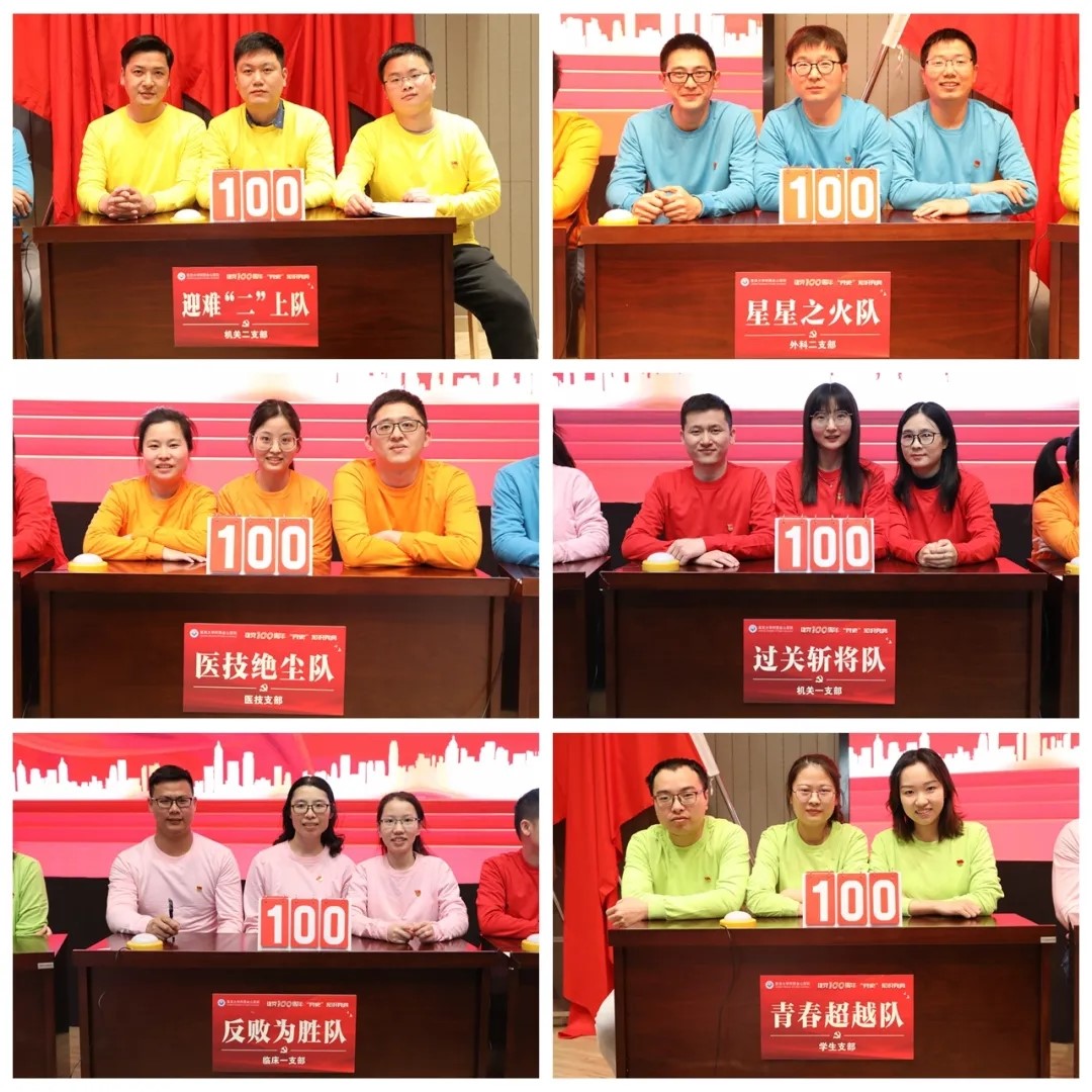 进入决赛的六只队伍:机关一党支部——过关斩将队、医技党支部——医技绝尘队、临床一党支部——反败为胜队、外科二党支部——星星之火队、学生党支部——青春超越队、机关二党支部——迎难“二”上队纷纷踊跃答题。观众互动抢答环节也受到了大家的欢迎,现场气氛活跃、热烈。经过必答题、抢答题、风险题的激烈比拼,大家在题海中重温党的光辉历史,继承和发扬党的光荣传统和优良作风,认清历史方位,汲取前行的智慧与力量。