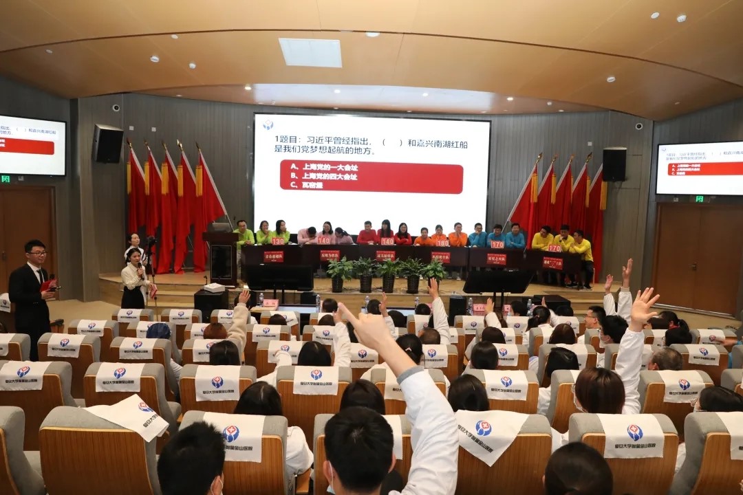 下午2点30分,在医院科教楼3楼,随着“星星之火,可以燎原、一枝独秀,所向披靡、医技绝尘,技高一筹……”等口号响起,金山医院庆祝中国共产党成立100周年系列活动党史知识竞赛(决赛)正式开始。