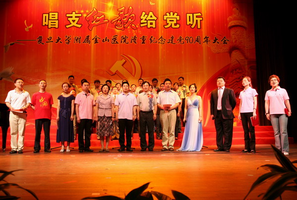 6月30日晚上,金山医院隆重纪念建党90周年大会暨表彰“两优一先”、“唱支红歌给党听”大赛在区少年宫小剧场举行。医院党委陈刚书记等党政工团领导、全体共产党员、入党积极分子,以及邀请的医院民主党派、少数民族和党外高知代表400余人参加。大会特邀嘉宾区卫生局党委副书记、纪委书记朱惠诚等领导参加会议并担任红歌比赛评委。