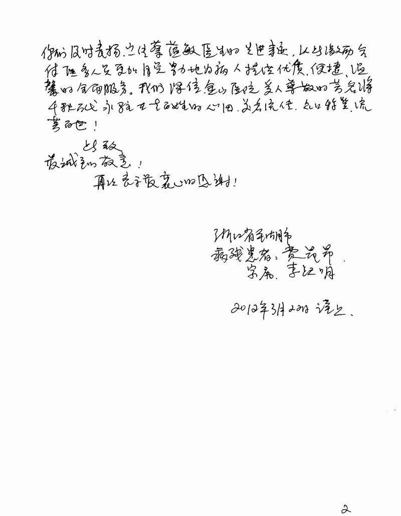 日前,浙江平湖费女士和家属给我院领导写信,讲述了她在我院就诊的经历和体会。现原文载上,以弘扬先进,激励医务人员,提高医疗服务质量,为病人提供优质的服务。