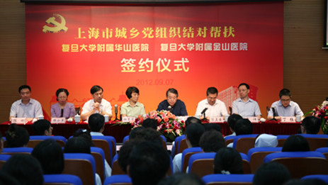 9月7日下午,在上海市教卫党委、上海市卫生局和金山区委的关心、支持下,复旦大学附属华山医院、金山医院结对共建(帮扶)签约仪式在金山医院核化楼322会议室举行。签约仪式由金山区委常委、组织部部长陈正安主持,市教卫党委副书记杜慧芳、金山区委副书记祝学军、副区长贾炜、市卫生局副局长瞿介明、复旦大学医管处处长夏景林、华山医院院长丁强、党委书记顾小萍及金山区卫生局、金山医院党政领导出席。