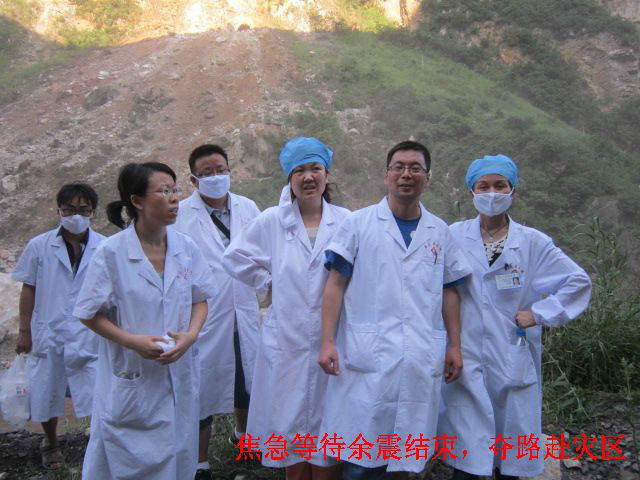 在云南彝良县人民医院的金山医院医疗队员准备出发,奔赴震中洛泽河镇(从右至左:医技党支部副书记张慧涨,病理科副主任叶宣光,B超室董彦,神经内科医生邬军锋,消化内科医生俞华芳)