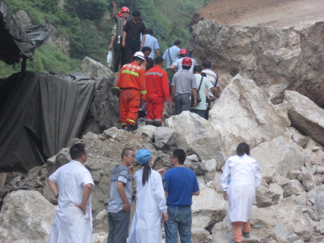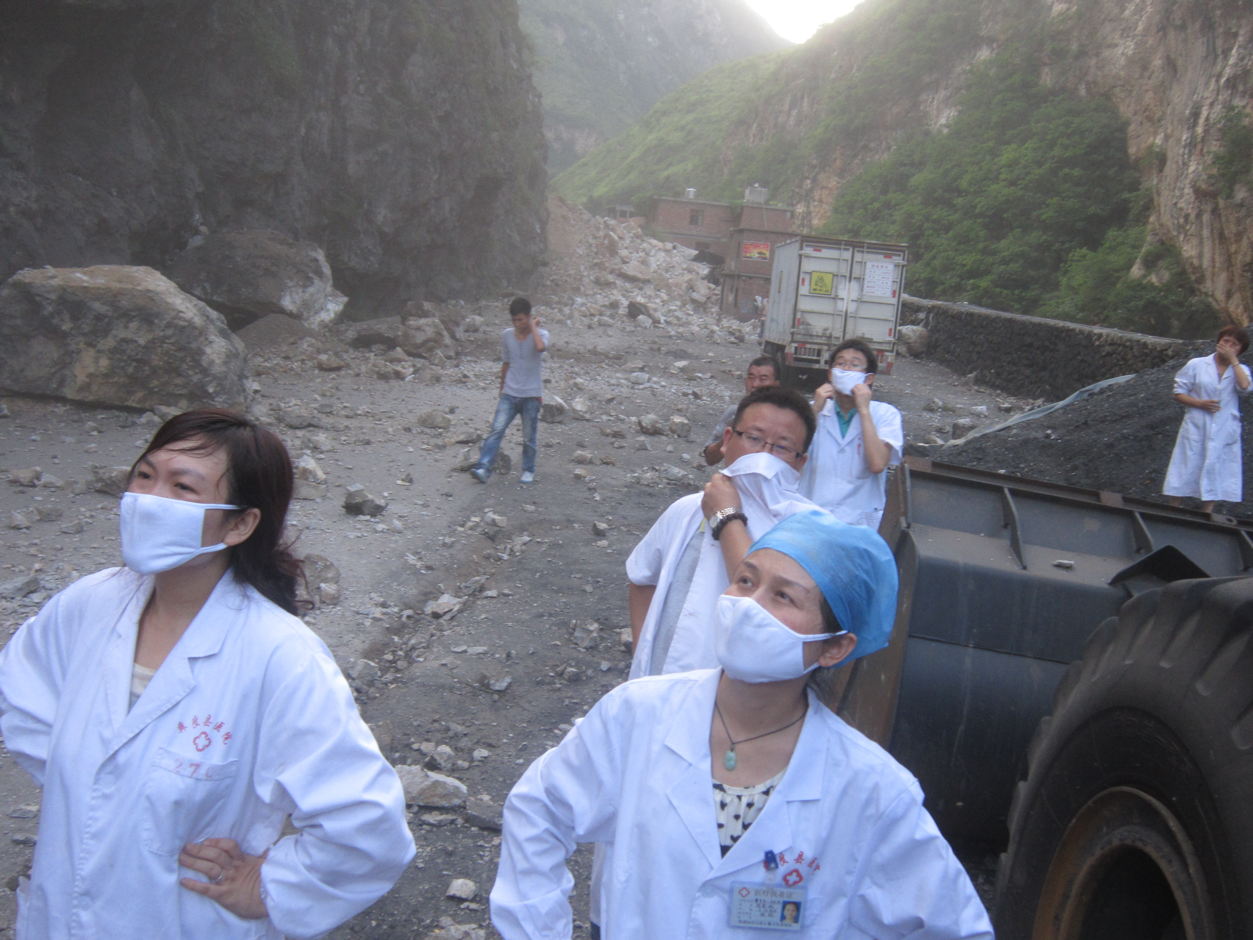 医疗队员们看着山体又一次滑坡,无法前进,焦急万分