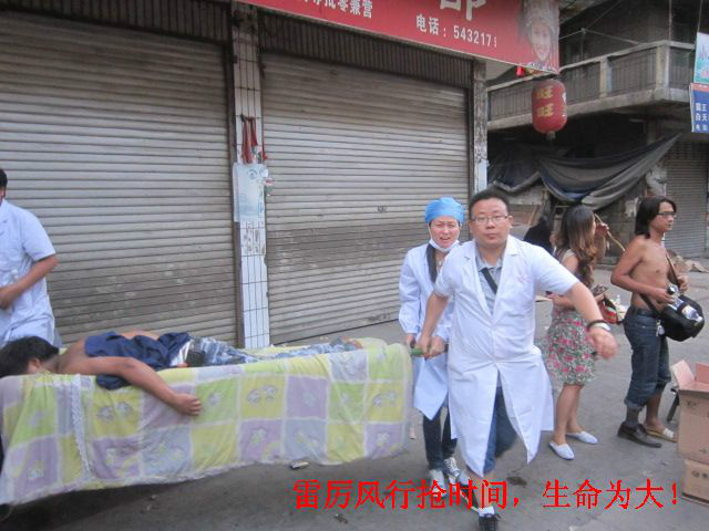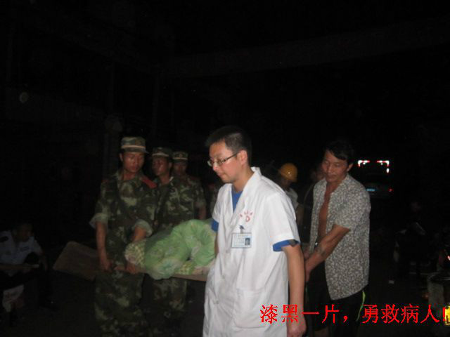 夜深了,可是我们医疗队救援行动还在进行着:叶宣光正抬着担架转运病人