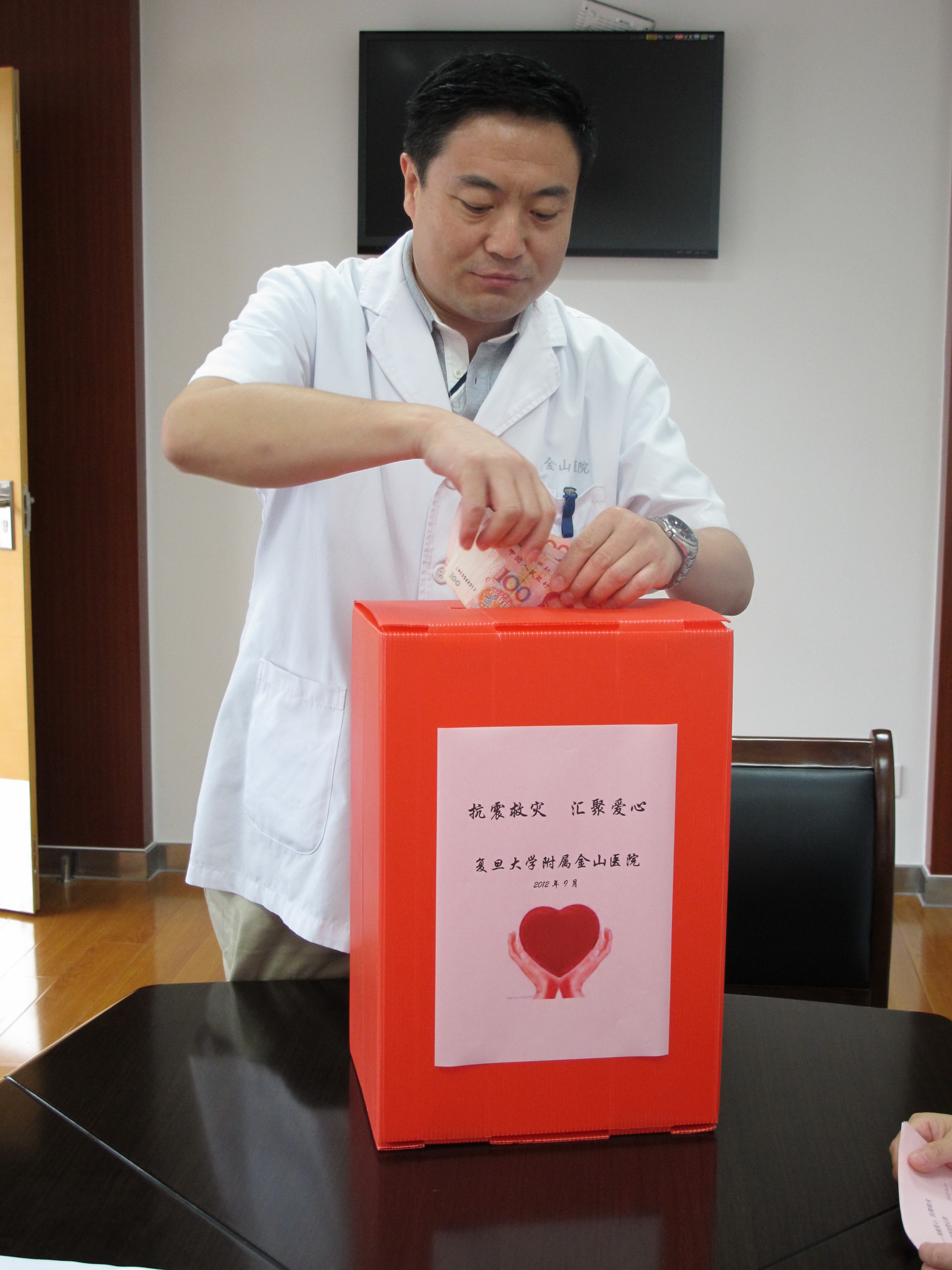 “云南地震,我们的队员正在现场积极参加救援行动,在后方我们要全力支持。”周一早党委书记陈刚召集相关部门、党支部书记召开紧急会议,部署工作。要求做到:与医疗队员每日电话,保持联系,并提醒队员们注意安全;向彝良县人民医院和队员们发慰问信;慰问队员家属;号召党员,行动起来,以实际行动帮助灾区人民、渡过难关,一系列措施迅速展开。天灾无情,大爱无疆,为了能让爱心尽快送达,党支部立即行动,设立了流动捐款箱,其中一位患者看见了爱心捐款箱,没有留下姓名,主动献出了自己的一片爱心。短短一天半,共有244名党员和147名群众参加捐款,共捐款45581元,现已全部汇入彝良县人民医院账户,用于抗震救灾工作。 能力不分大小,捐款不分多少,善举不分先后,贵在有份爱心。相信您的仁爱之心将重燃一个新的生命之星火,您的点滴之恩将托起生存的希望!在此,对大家的一片爱心表示深深的感谢!我们坚信:用我们的爱心,能给予灾区人们力量,在这种大无畏的气势中,灾区人们一定能战胜这次地震带来的突发灾难,重建美好的家园。