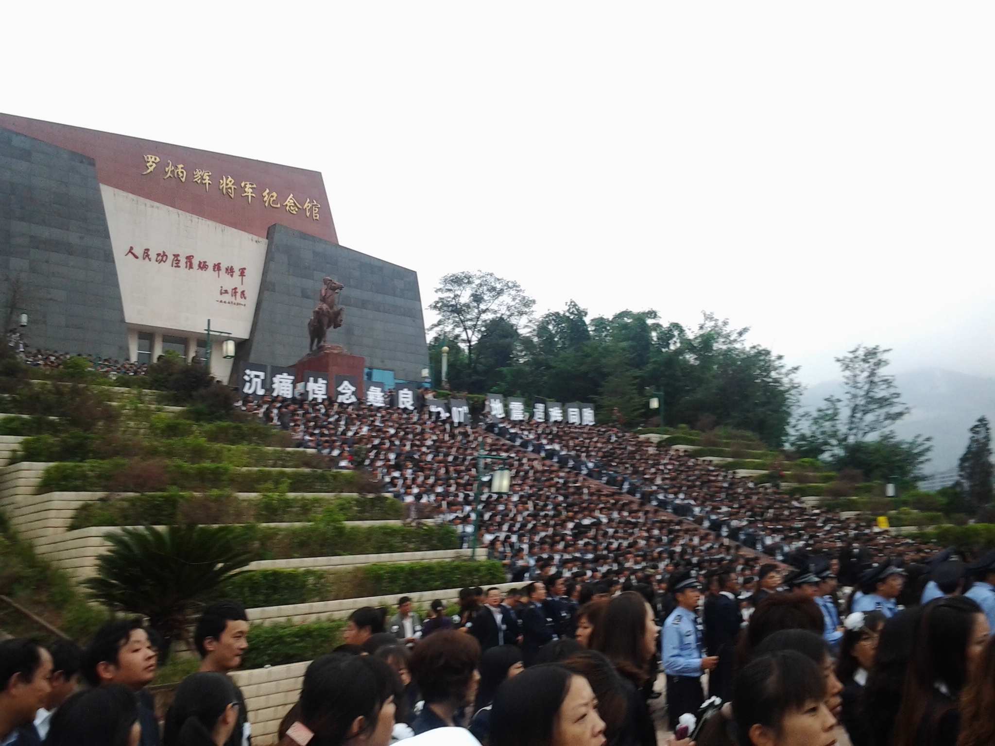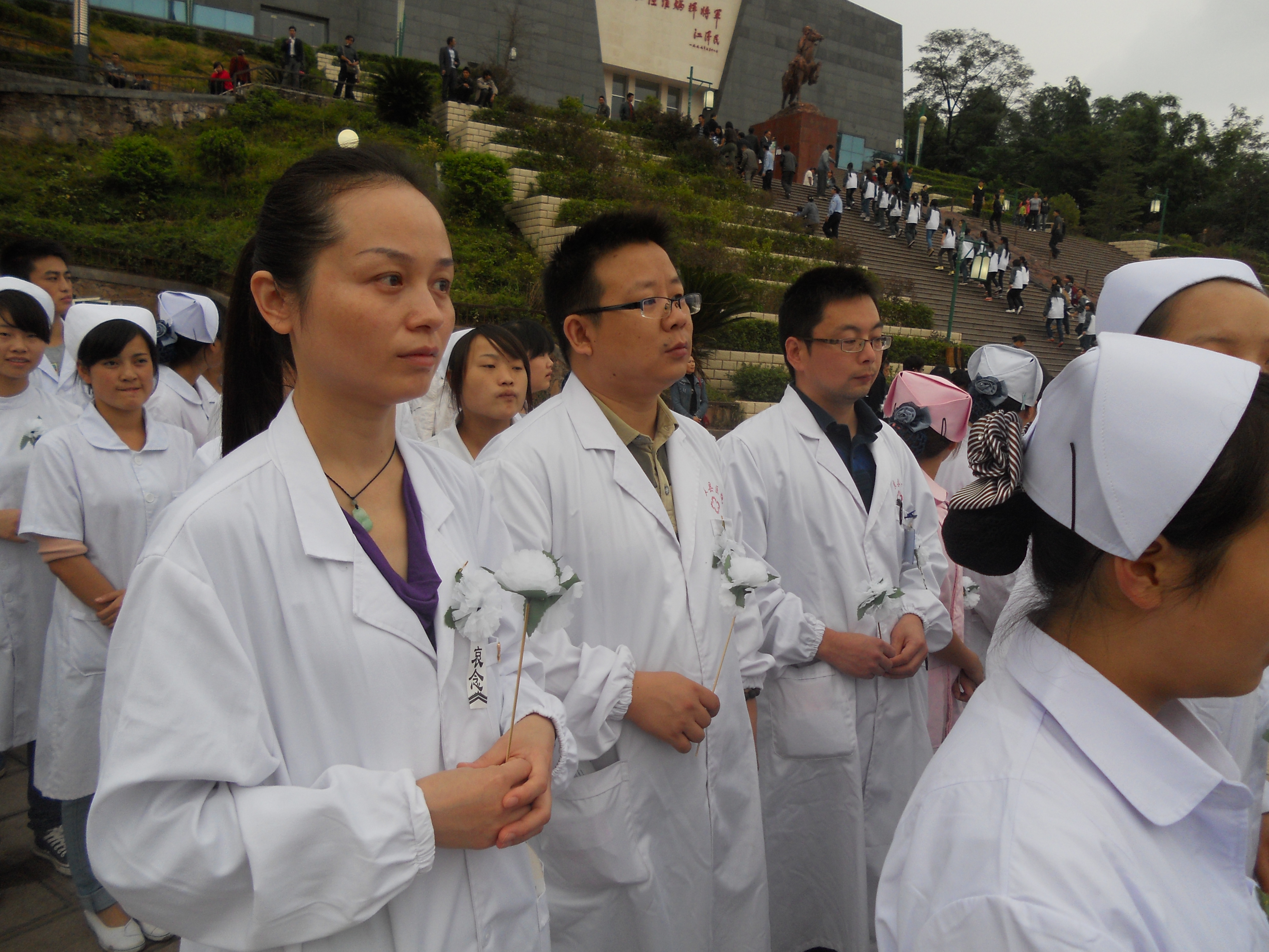 9月20日 星期四 今天天气一天阴沉,似乎在倾诉着一种哀思,压得我们的心头也是沉重异常。 一早我们先忙好病房巡查,处理好自己的医疗工作,确保医疗正常运行后,我们赶去罗炳辉将军纪念广场,参加由县政府举办的“沉痛悼念9-7地震遇难同胞追悼会”。 从医院一路步行至广场,大家都心有所想,百人的队伍步行整齐而沉静,没有人喧闹,有的只是沉思。到广场的有部队、学生、行政机构、医护、工人、干部、群众七大方队,通过对遇难者的追忆,大家自觉地聚集到一起,我们默默地用自己的方式,表达对9-7地震和9-11洪灾中远逝生命的哀思。当防空警报响起,大家摘帽肃立,默哀3分钟。默哀后点上手中的蜡烛,几百盏烛火在微风中轻轻飘扬,希望用这些光芒照亮他们前去的道路。此时,不知从哪儿飞来一群信鸽,在我们的头顶来回盘旋,最后随空而去,我想它们已带去我们的牵挂与思念。深深地对着天空鞠了个躬,献上精心制作的白色绢花,同胞们一路走好,你们是我们心中永远的牵挂,承载着这份永久的思念,用坚定的信心与信念,我们会克服一切困难。 人在广阔的大自然中是极其渺小的,但是我们相信只要我们团结起来,渺小的我们终将成为巨人,一个强大而勇敢的巨人。