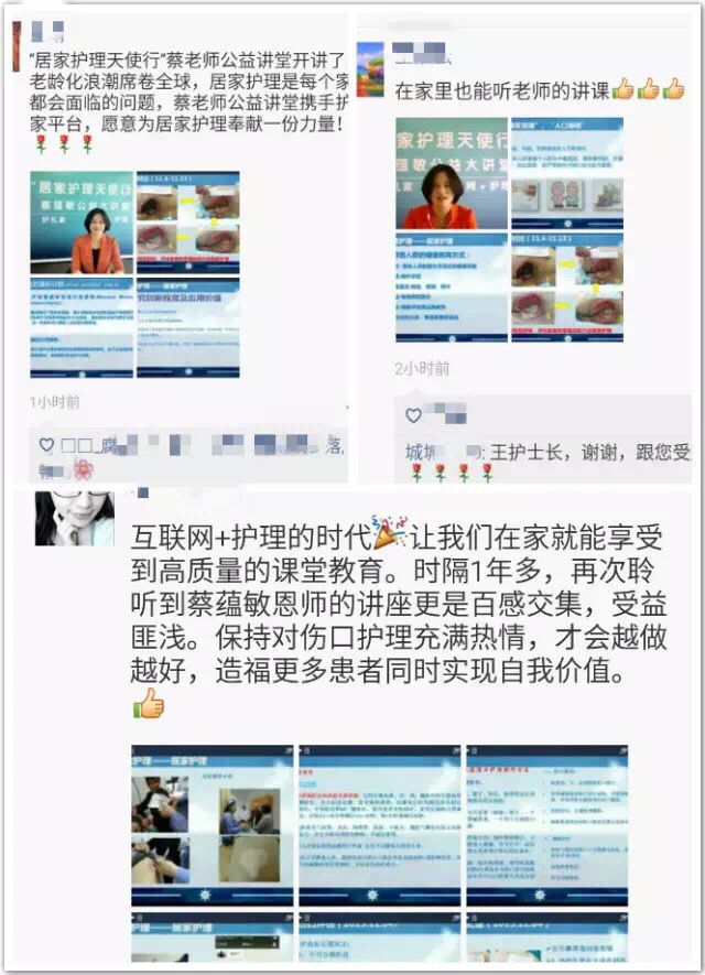 4月24日,“居家护理天使行”——蔡蕴敏公益大讲堂正式开课!由我院造口师蔡蕴敏老师为在线的500多位护理天使及其患者与患者家属介绍《老龄化社会的现状及压疮案例分享》。 蔡老师根据她20余年的临床伤口护理经验,在课程中主要阐述了老龄化社会的护理现状、老龄化社会所带来的护理问题,还分享了自己亲自护理的部分压疮案例,从实践出发,为在线听课的护理师圈出在护理过程中的重点和注意事项。同时,为了为更多的护理老师解疑答惑,蔡老师还特地邀请了第二人民医院赵志芳老师在讲堂现场协助答疑工作。对于压疮的居家护理,蔡老师指出,定时翻身是预防压疮的最有效措施。同时照护者需每日对压疮患者进行质量监控,每周陪同患者门诊就诊一次,定期评估伤口情况。 目前国内外在压疮护理方面还存在着明显的差异,发达国家早已普遍利用网络进行远程医疗咨询服务和健康教育,而国内对压疮的居家护理工作,主要是亲属或陪护进行照护。并且,由于照护者缺乏压疮护理知识和技能,常常导致压疮护理效果差,甚至向更严重的趋势发展。 蔡蕴敏公益大讲堂后,不少护理师们对在线课堂模式非常满意,感受到了互联网学习的便利,终于不必再舟车劳顿赶赴外地学习,在家就可聆听护理专家的课程解说。还能把自己在临床上遇到的疑难伤口发到群里,和来自各个地区的护理师们共同探讨案例。同时,蔡老师的在线讲课也迎来患者及其家属一致好评。录制的课件经过后期剪辑制作后,也将放在护理家APP的学习界面,供更多的人进行学习。 利用方便经济快捷的网络服务是未来开展延续护理的最佳选择方式之一。据悉,蔡老师和她的护理团队自入驻护礼家平台后,已在线服务患者120余人次,联合会诊9人。为了更好地指导伤口护师,她还亲自为平台制定了“伤口记录模板”,方便伤口护理师们在护礼家平台在线记录伤口案例。除护礼家平台外,她还建立咨询微信群,在线为专业护师解答,目前已有700余人参与。 用“心”传授,用“心”服务,她永远怀揣着一颗爱心,化腐朽为生机,一切为了解除患者苦不堪言的伤痛。